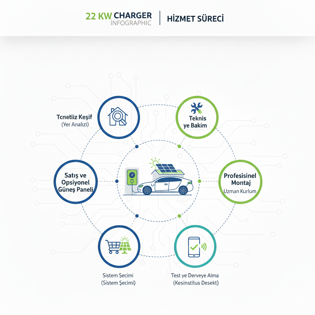 Hız ve Gücü Enerji Bağımsızlığıyla Birleştirin! 22 kW kapasiteli yeni nesil akıllı şarj istasyonumuzla aracınızı en yüksek hızda şarj edin. Sadece cihaz satışı değil; profesyonel keşif, anahtar teslim montaj ve teknik servis güvencesi sunuyoruz. İsterseniz şebekeye bağlı, isterseniz opsiyonel güneş paneli entegrasyonu ile kendi enerjinizi üreterek bedava sürüşün tadını çıkarın!